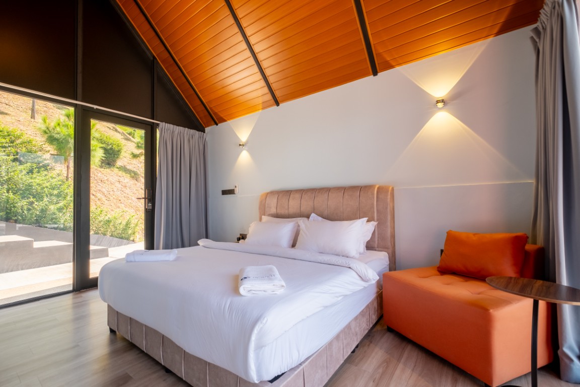 "A spacious king-sized bed and inviting reading nook provide comfort, while adjustable lighting adds a romantic touch. This enchanting getaway invites couples to reconnect in the embrace of nature's beauty."A unique couple's room features an A-shaped structure surrounded by lush greenery, blue skies, and fluffy clouds. Inside, minimalist design and natural materials create a cozy atmosphere. A king-sized bed and reading nook offer comfort, while dimmable lighting and a comfy living space enhance the romantic ambiance. It's a magical retreat for couples to reconnect amidst nature's beauty.""A luxurious king-sized bed beckons with soft linens and plush pillows, while nearby, a cozy coffee corner awaits"